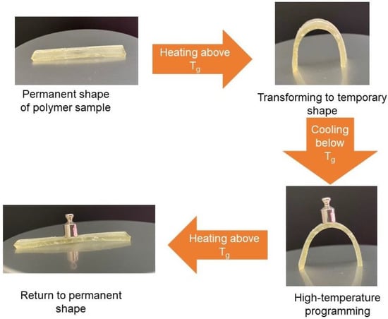 Thermo-responsive shape-memory polymers attract huge interest in the scientific community because of their unique ability to remember their shape. To show shape-memory properties, polymer samples were heated above their glass transition temperature, reformed to the temporary shape, and cooled down to the temperature lower than their Tg. All polymers were rigid materials and were able to maintain their temporary shape when the temperature was below their Tg. To return to a permanent shape, polymer samples were heated above their glass transition temperature, and all polymers were able to return to a permanent shape within seconds. The recovery to original shape conditions of these polymers is determined by their glass transition temperature [14].