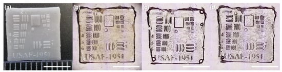 A microtransfer molding (μTM) technique, or nanoimprint lithography, was used to test C1 and C8 resins to make replicas [29]. First, a master structure was manufactured out of PlasGray material with the Asiga Pico2 39 UV table-top 3D printer (Asiga, Alexandria, Australia). Next, polydimethylsiloxane (PDMS) was poured over this structure and thermally cured at 100 C for 1 h, thus creating a soft mold (stamp). It was then used to make a replica of both resins. The printed structure was a 1951 USAF resolution target (25% of the downloaded vector file size), used as a sample in optical engineering for testing imaging systems. A UV diode emitting 365 nm wavelength light (CS2010, Thorlabs, Newton, NJ, USA) was used to cure the C1 and C8 resins and obtain the replicas. The curing time was set to 5 min for each sample. The soft mold and the replicas made were characterized using the Olympus IX73 optical microscope (Olympus Corporation, Tokyo, Japan).