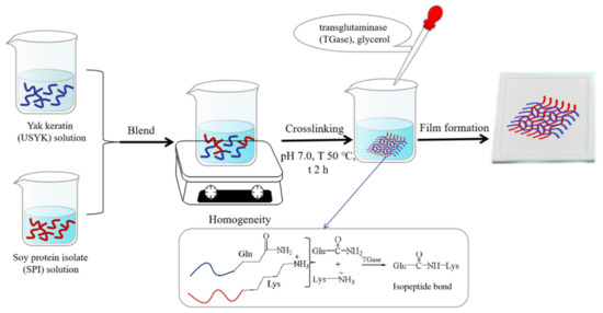 In our previous research [31], yak keratin (USYK) was successfully extracted from discarded yak hairs by the urea and sodium sulfide combined method. In the present study, in order to make good use of this discarded yak hair and reduce environmental pollution, a novel USYK-SPI bioplastic film was prepared by Gln-Lys isopeptide bond crosslinking. It is reasonable to believe that the use of plant protein (SPI) to partially replace animal protein (USYK) during film formation produces a certain synergistic effect. It can not only optimize the structure of the USYK-SPI bioplastic film and endow the USYK-SPI bioplastic film with unique functions but can also reduce the production cost and expand the application range of bioplastic film.
