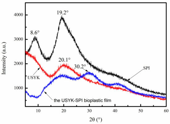 The X-ray diffraction (XRD) pattern of USYK, SPI, and the USYK-SPI bioplastic film (volume ratio: SPI/USYK of 3/1).