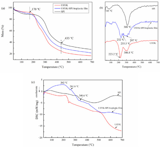 TG (a), DTG (b), and DSC (c) curves of USYK, SPI, and the USYK-SPI bioplastic film (volume ratio: SPI/USYK of 3/1).
