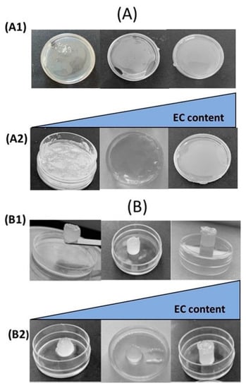 Macroscopic visual appearance of the EC/VCO-based oleogels prepared at different EC/VCO content (A) before molding—RT (A1) and 37 °C (A2); and (B) after molding—RT (B1) and 37 °C (B2).