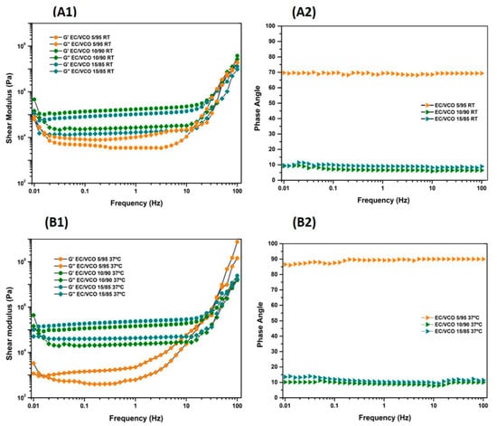 Viscoelastic properties of the molded EC-based (A1,B1)/VCO-based (A2,B2) oleogels in the function of the frequency, grouped according to the molding temperature: (A) RT and (B) 37 °C.
