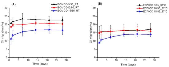 Oil migration from the EC/VCO oleogels to the filter paper for 28 days. Temperature conditions: (A) room temperature and (B) 37 °C.