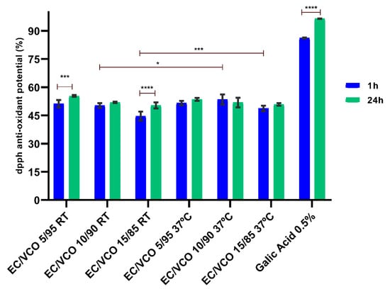 Antioxidant activity of the EC/VCO-based oleogels compared with gallic acid (**** p < 0.0001, *** p < 0.001 and * p < 0.05).