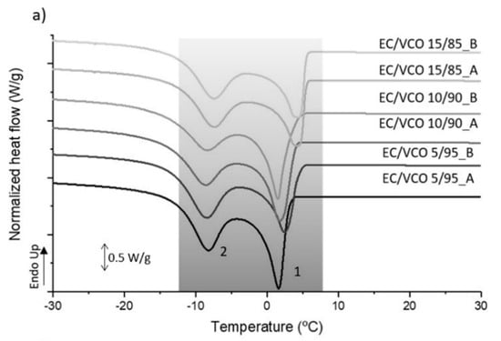 DSC thermograms obtained for EC/VCO oleogels using 10 °C/min−1; (a) crystallization process and (b) melting process.