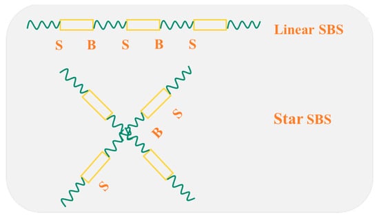 Asphalt pavement consists of aggregates, fillers, and asphalt binders; the design of asphalt binders and research on its related properties remain at the core of asphalt pavement [,]. Using an asphalt binder with excellent properties can remarkably improve the quality of asphalt pavement [,]. With the increasing traffic load, a neat asphalt binder will not be enough to fulfill the requirements of traffic development [,]. Styrene-butadiene-styrene (SBS)–modified asphalt (SBSMA) is universally applied because of its properties such as excellent durability, anti-ageing, fatigue resistance, and water damage resistance [,]. SBSMA has been utilized extensively on national highways in China [,]. SBS is a block copolymer created from the anionic polymerization of 1,3-butadiene, styrene (monomer), tetrahydrofuran (activator), and n-butyllithium (initiator) in the cyclohexane solvent []. According to the different contents of polystyrene and polybutadiene, as well as the difference in the molecular structure, SBS can be divided into the linear and star structures, as shown in Figure 1 []. In general, the molecular weight of the star structure is higher than that of the linear structure. Previous research and applications have suggested that the SBSMA content in many countries is 3.0–6.0%, considering the limitations of asphalt pavement construction costs and construction technologies [,]. Yet, no in-depth investigation has been conducted on the higher dosage of this material. However, porous asphalt concrete has been more and more used in pavement materials with the advancements in pavement green technology [,]. Therefore, modified asphalt with high viscosity is commonly applied in porous asphalt concrete [,]. At present, modified asphalt with high viscosity is mainly fabricated using a high content of SBSMA (6.0–12.0%) [].