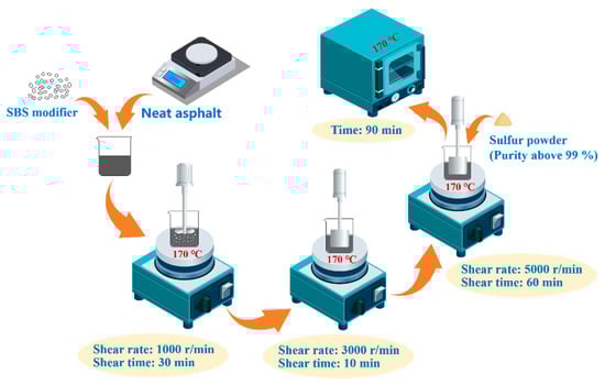 SBSMA can be prepared as Figure 3. First, the corresponding quality of neat asphalt, SBS modifier, and stabilizer was weighed. We heated the neat asphalt to the molten state in an oven. The weighed SBS modifier was added into it and stirred with a vane stirrer at 170 °C and 1000 r/min for half an hour. The blended neat asphalt and SBS modifier were then sheared by a shear emulsifying machine at 170 °C and 3000 rotations per min for 10 min. Next, the stabilizer was added, and the mixture was sheared for an hour at 170 °C and 5000 rotations per min. Finally, the sheared SBS modifier was heated at 170 °C for 90 min to allow the prepared SBSMA to fully develop and escape the air bubbles created during the preparation process.