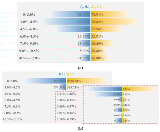 The SBSMA’s sensitivity to stress can be expressed by the difference in the Jnr under 3.2 kPa and 0.1 kPa, which is calculated according to Equation (3).