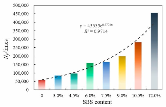 Figure 9 shows different asphalts’ fatigue life at 2.5% strain. The fatigue life of SBSMA increases exponentially with the increasing modifier content. This is because with the increase in SBS modifier content, the distribution of the SBS phase in asphalt gradually forms a cross-linking state, which increases the fatigue life. Specifically, for Shell 70# neat asphalt, Nf increased by 47.3% after adding 3.0% of the star SBS modifier. For SBSMA, when the content rises from 4.5% to 6.0%, the change rate of Nf is the largest (63.9%), followed by the change rate from 10.5% to 12.0%, and the change rate from 6.0% to 7.5% is the smallest (2.8%).