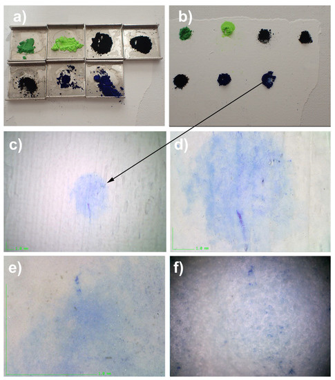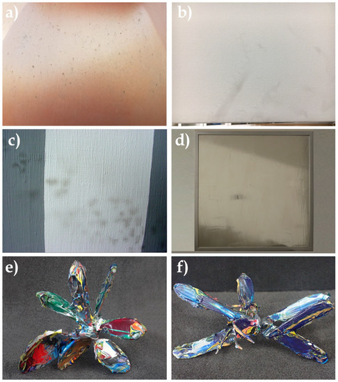 (a) Detail from an artwork by Allan Mc Collum, Three Perfect Vehicles, 1988/2004, 203.2 cm × 91.4 cm × 91.4 cm, made from acrylic latex paint on glass fiber. The artwork is exhibited outside and has a thin layer of particulate matter on its surface. (b) Detail of a work in acrylic paint on canvas, dating from 1998: in the shape of a very extended halo, particulate matter and UFPs are deeply anchored; this damage seems almost irreversible. (c) Detail of a work in acrylic paint on canvas dating from 1975: the particulate matter is deeply anchored and has clearly been deposited by bubble-wrap packing via direct contact with the surface. (d) Bertrand Lavier, Untitled (from the Mirror series—clear medium on an acrylic mirror, contained in the original artist’s frame), 61 cm × 61 cm. (e) Lucas Samaras, work without title (Utensils #49), from the 2001 series Utensils, acrylic on metal, 12 cm × 12 cm × 14 cm. (f) Lucas Samaras, work without title (Utensils #73), from the 2001 series Utensils, acrylic on metal, 21 cm × 12 cm × 8 cm.