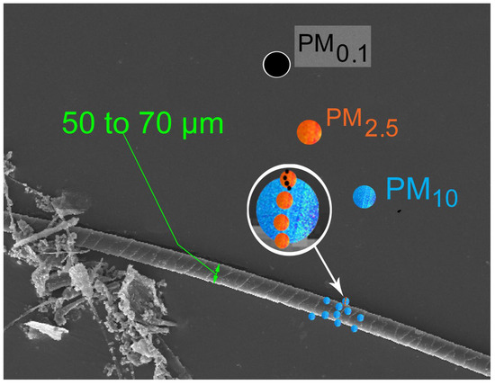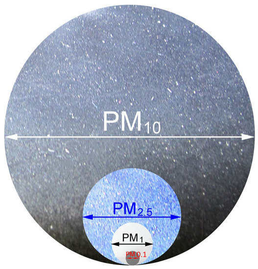 The smallest range of particles, ultrafine particles, consists of particles that are more than 100 times finer than PM 10 (for particles of the same chemical composition, toxicity increases with decreasing size) (ibid. [51,52]), as shown in Figure 3.