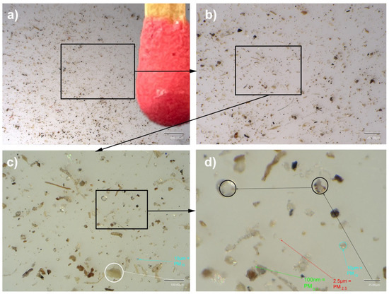 (a) Comparison scale under an ultra-high-accuracy 4 K microscope (Keyence VHX-7000); a matchstick head is shown for scale. Magnification 30×. (b) Detail of (a) at a magnification of 100×. (c) Detail of (b) at a magnification of 300×, where PM 10 (in blue) start to be identifiable. (d) Detail of image (c) at a magnification of 1000×: PM 2.5 starts to become visible (in red) but nanoparticles (PM 0.1 in green) are still hard to identify.