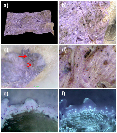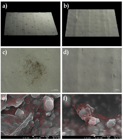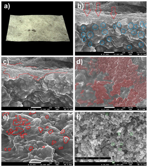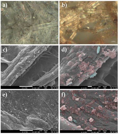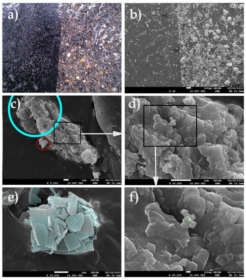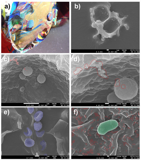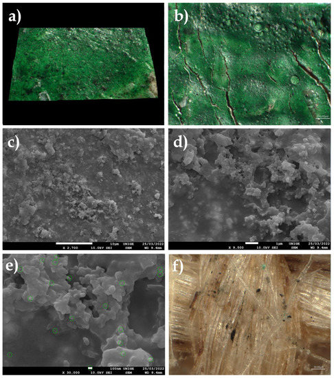Examples of various sizes of particles and the nature of dust collected on the back of an artwork. (a) Dust deposited on an SEM stub (carbon tapes): coarse particles on the right part, thin particles on the left. Magnification average 40×. EDS (energy-dispersive X-ray spectroscopy) analyses revealed various compositions: C, N, O, Na, Mg, Al, Si, S, K, Ca, and Fe. See Table 1. (b) View of particles at an SEM magnification of 45×, scale 100 µm. (c) Scale 1 µm: PM 10 (in blue) and PM 2.5 (in red) can be identified. Magnification 5000×. (d) Particles at a magnification of 20,000×. (e) Aggregates of salt crystals, identified in turquoise, at a magnification of 14,000×. EDS analyses have revealed various compositions: C, O, Si, S, K, and Ca. (see (e,f)) At a scale of 100 nm, magnification 45,000×, examples of PM 0.1 nanoparticles are identified in green.
