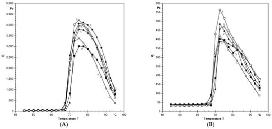 47]. Excluding cv.W-445, where the G″ value was increased, all OSA-modified starches had lower G′ and G″ values than their native counterparts [