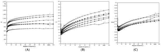 Figure 2A–C. The peak G′ value of starches ranged from 641 to 1084 Pa, with cv.GHB-732 and cv.HC-10 having the highest and lowest values, respectively. With the increase in frequency, the magnitude of G′ and G″ increased significantly (