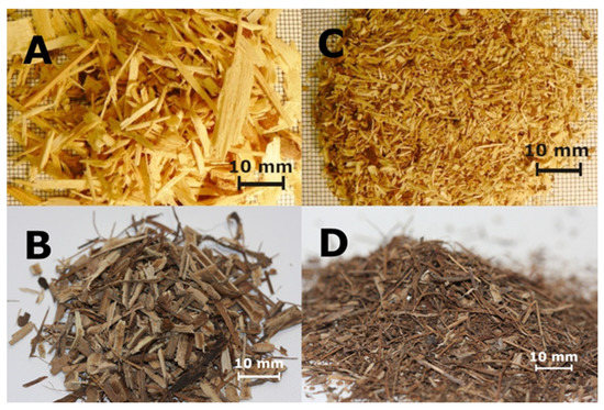 The particles of vine pruning waste: particles for the core layer are (A) pinewood and (B) vine pruning; particles for the face layers are (C) pinewood and (D) vine pruning.