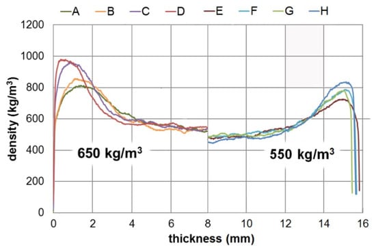 The manufactured particleboards were characterized by an average density ranging from 666–669 kg/m3 for variants A, B, C and D, and from 563–579 kg/m3 for variants E, F, G and H (Table 4).