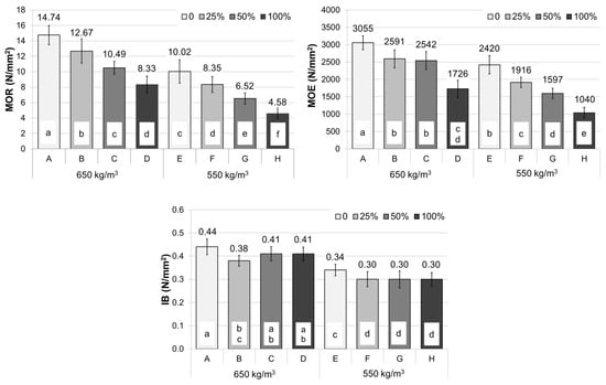 Mechanical properties of particleboards, a–f correspond to the homogeneous groups by Tukey test (α = 0.05).