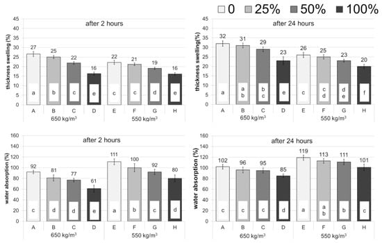 The thickness swelling after soaked in water for 2 h and 24 h was determined based on the EN 317 [28] standard. The test involved 10 replicates for each variant.