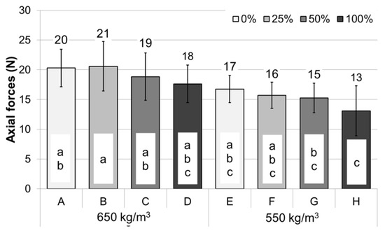 Machinability is one of the key properties of wood-based panels. The easy machining of materials determines the possibility of giving the right shapes to processed composites for a given type of application. Analyzing the axial forces for drilling shown in Figure 5, it can be seen that the increase in the content of vine pruning waste caused a slight decrease in the value of the axial force for drilling. It should be noted, however, that the decrease in the parameter, in this case, was not statistically significant. The dependence of axial force during drilling on the density of the produced particleboard is much more visible. The decrease in density corresponds to the decrease in the axial force. This relationship corroborates the study of Podziewski et al. [40].