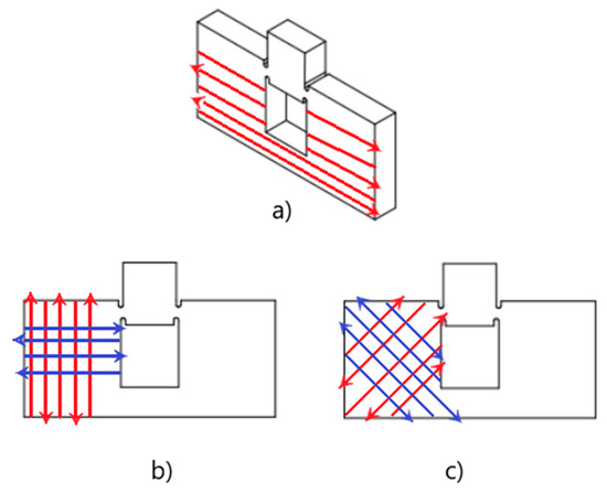 Sketch of specimen configurations with their respective raster orientation sequences (a) Vertical; (b) 0°/90°, with 0° oriented in blue and 90° oriented in red; (c) 45°/−45° with 45° oriented in red and −45° in blue.