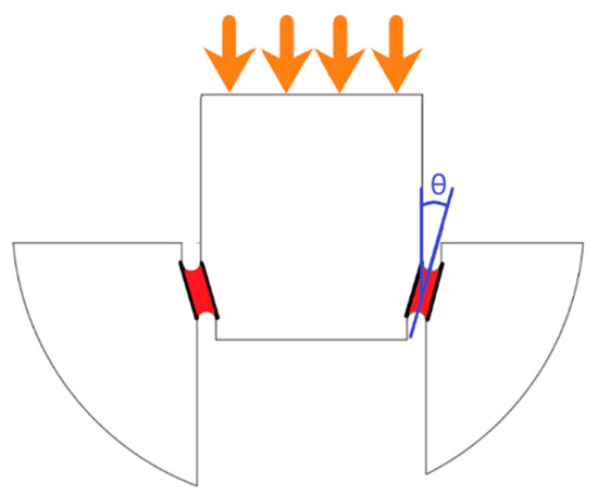 Schematic of specimen showing the shear notch zones (red) with a shear angle (θ).