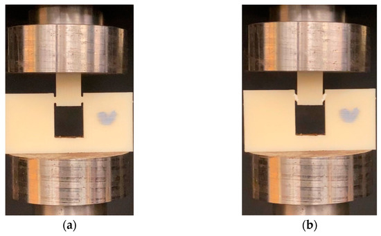 Experiments were performed on the shear test specimens using an INSTRON 5569 (Instron, Norwood, MA, USA) in displacement mode. As shown in Figure 4, the specimens were placed between two compression platens, where the top platen was moved at a displacement rate of 1.27 mm/min. The experiments were done at room temperature, where load-point displacements and load values were recorded for each test specimen. The compression of the top hat induced pure shear deformation between the notches in the shear zone (as shown in Figure 2). Using the MicroCapture® Pro digital microscope (Instron, Norwood, MA, USA), the shear deformation was captured for the entire experiment duration. A minimum of six identical experiments were performed for each configuration to have statistical significance. Using load-point displacement and applied compressive load, the shear strain and shear stress were calculated using the following equations: