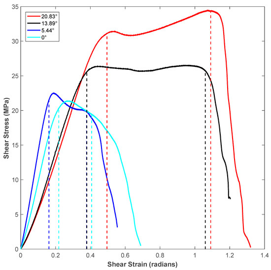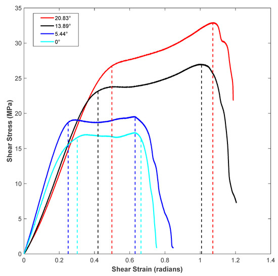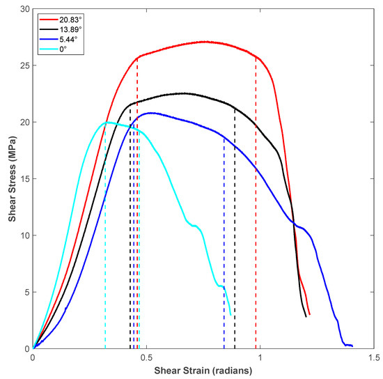 It can be noticed in the shear zone of Figure 5 that the specimen experienced maximum shear stress (shear strength) at a later part of the shear zone as the shear angle of the specimen increased. Moreover, both the shear flow stress within the shear zone and the length of the shear zone increased as the shear angle of the shear test specimen increased. The measured values of shear zone length (in terms of units of shear strain, which is in radians) for different shear angles is shown in Table 3. The shear zone increased by about 3.5-times when the shear angle increased from 0° to 20.83° for specimens of vertical roster orientation. This could be explained by the fact that the incremental shear angle gave way for more filament in the specimen’s shear region, which led to an increased length of the shear zone of the flat hat specimen, as listed in Table 2. During the sliding portion of the stress-strain diagram of each shear angle, the shear stress dropped as the material in the shear zone was no longer connected to the supports of the specimen.