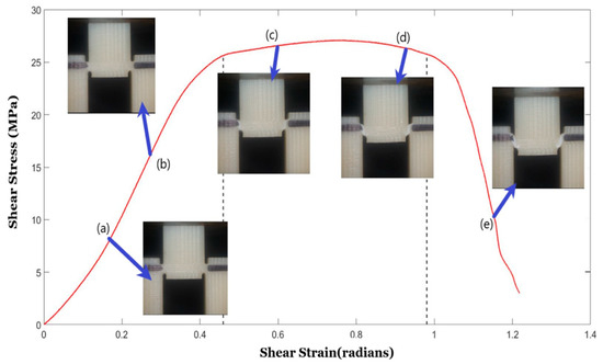 Example of the Shear zone in a vertical raster-oriented print provided with real time photos from video recording taken at each section in the graph. Sections are denoted by the corresponding letters of arrows; (a,b) represent the specimen undergoing small visually unnoticeable shear deformation, (c,d) represents the shear zone in which the specimen begins to deform significantly, and (e) represents the sliding of the sheared piece.