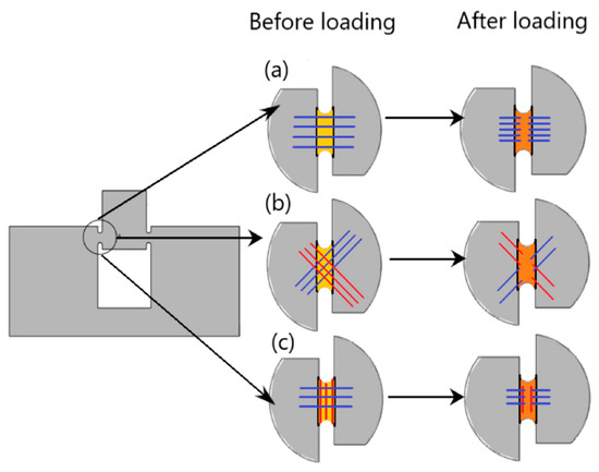 Schematic representation of filaments before and after loading for each raster orientation; (a) Vertical, (b) +45/−45°, and (c) 0/90°.