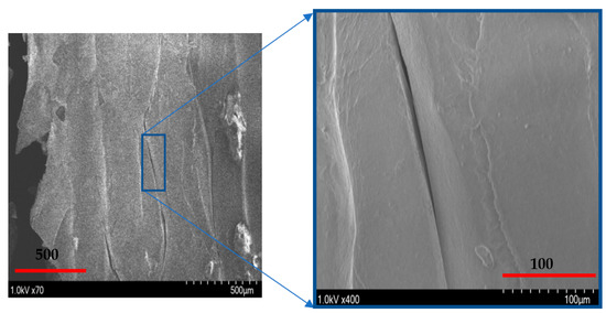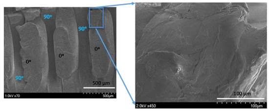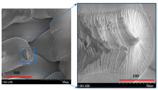 A schematic of the failure of extruded filaments for test specimens of each raster orientation is shown in Figure 7. For vertical raster orientation, as shown in Figure 7a, the extruded filaments of horizontal direction got sheared off under shear deformation. In Figure 7b, shown for 45°/−45° raster orientation, the filaments of either 45° or −45° were sheared off. Finally, for specimens of 0°/90° raster orientation, shown in Figure 7c, the filaments of 0° were sheared off, whereas those of 90° remain intact. Figure 8 shows the image of scanning electron microscopy (SEM) of vertically printed test specimens. It is clearly evident from the failure surface that the filaments that were oriented horizontally in the vertical built were sheared with a large deformation. During this process of shearing, the gaps that typically exist between the extruded filaments while printing were also closed. Moreover, the failure surface of sheared filaments showed a smooth surface due to less resistance offered by the filaments compared to the other two raster orientations, as the shear flow stress gradually reached a maximum value and decreased steadily until the end of the shear zone, as shown in Figure 5.
