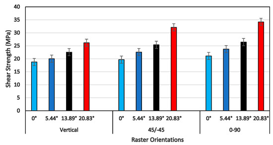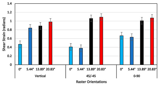 A comprehensive plot of the shear strength of all three raster orientations and four shear angles is shown in Figure 13. In general, the shear strength increased as the shear angle increased for all three raster orientations. However, the shear strength increased only by about 50% for vertical orientation, by about 63% for the +45°/−45° orientation, and by about 55% for the 0°/90° orientation, as the shear angle increased from 0° to 20.83°. Although the percentage increase of shear strength for 0°/90° was less than that of the +45°/−45° orientation, the values of the shear strength for all four shear angles of 0°/90° were slightly higher than those of all of the other two orientations. This was due to the presence of a constraint provided by the extruded filaments of the 90° direction, as the filaments of 0° underwent large-scale shear deformation and failure. This was clearly evident from the shear stress-strain response that the shear flow stress increased as the shear strain increased, and the maximum shear stress happened at the end of the shear zone (shown in Figure 11) against other two raster orientations, except for a specimen of a shear angle of 20.83° for the +45°/−45° raster orientation. When the shear strength values shown in Figure 13 were compared with tensile strength values of the 0°/90° and +45°/−45° orientations, the shear strength for the shear angle of 0° was about 65% less than that of the tensile strength for both raster orientations [27,29].