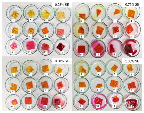 The response to buffer solutions (acid and alkaline) of the gelatin films with added SE is presented in Figure 1. This approach is used to assess the capacity of color-indicator films to respond to variations in pH. This alteration may be detected in packaged foods when they begin to deteriorate (food decomposition under basic conditions) or ferment (fermented food under acidic conditions) [49]. At pH 7, the color of gelatin-added SE film was the same as the film before being submerged, while the intensity of orange color was decreased in pH 5–6. The color of the films was changed from orange to yellow at pH of 1–4, followed by pink at pH 8–10, and it became red at pH 10–12. At the same pH levels, only different intensities of color can be observed among the different concentrations of SE added. The color change of the SE-added film with different pH values is closely related to the change of chemical forms of brazilin that are present in SE. Sappan heartwood is a recognized source of brazilin and brazilein (the oxidized form of brazilin) [50].
