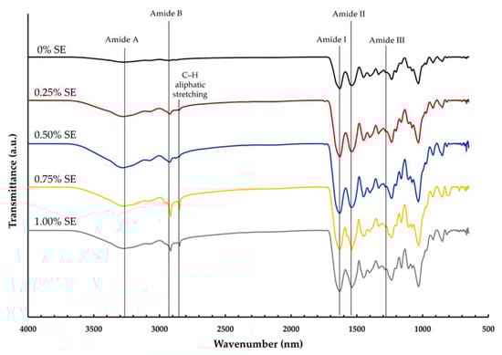 Figure 2 shows the FTIR spectra of gelatin film incorporated with SE at various concentrations. The spectra of the film adding SE at all concentrations revealed a similar pattern to that of the control film, indicating no significant differences in the functional group. The gelatin film found the prominent peak at 1627 cm−1 (amide I, C=O stretching), 1550 cm−1 (amide II, N–H bending), and 1244 cm−1 (amide III, C–N stretching, and N–H vibrating). The existence of amide A (N–H and/or O–H stretching) and amide B (C–H stretching and NH3+) was demonstrated by the peaks at 3272–3283 and 2931–2936 cm−1 [25,27]. Compared to the neat gelatin film, amide A, amide I, amide II, and amide III of the SE incorporated film at all concentrations were seen at similarly wavenumbers. However, the amide B peak was shifted to lower wavenumbers when added SE. The amide B peak was shifted from control film 2932 to 2923, 2925, 2916, and 2917 cm−1 for a film containing 0.25, 0.50, 0.75, and 1.00% SE. The peak at 1032 cm−1 was found in all film samples; it related to the interactions between the OH-group of glycerol and the film structure [63]. It was observed that the amide A peak became wider and sharper after adding SE. For the film incorporation with SE, the peak at 2850 cm−1 occurred, corresponding to the C–H aliphatic stretching vibration [64]. Moreover, in films containing SE, the amide I and II peaks were sharper; because the C=O, N−H, and O−H bands in polyphenol compounds can easily form the intermolecular hydrogen bond [65]. According to the FTIR spectra, the addition of SE can form a hydrogen bond with a related functional group to reduce free hydrogen that can form hydrophilic bonds with water.