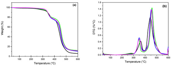 The thermal stability of the recast Nafion and hybrid Nafion–WO3 membranes with different concentrations was investigated and studied using thermogravimetric analysis under N2 atmosphere (Figure 5). First, all membranes showed a small weight loss between ca. 50 and 250 °C, which is related to the removal of water (Figure 5b). A more pronounced weight loss indicating the degradation of Nafion can be seen between 300 and 400 °C. The degradation temperatures shifted to a lower temperature for the hybrid membranes compared to the pure Nafion membrane. The unfilled recast membrane started to decompose at around ~320 °C, whereas the hybrid membranes decomposed at ~290 °C; the decomposition peak maxima being around 360 and 330 °C, respectively. This indicates that the incorporation of WO3 in the Nafion accelerates the decomposition of the membrane, probably through the deterioration of thermal stability of the SO3H groups. As reported, this mass loss is attributed to the decomposition of the acid SO3H groups of Nafion, which starts at ~280–300 °C and lasts up to 370–400 °C [53,63]. The further weight loss observed above 400 °C corresponds to the decomposition of the polytetrafluoroethylene backbone chains in the Nafion polymer. In this case, the decomposition temperature of the hybrid membrane appears to be higher than that of the recast membrane, which indicates a stabilising effect of the WO3 nanofiller. For all the hybrid membranes, the weight residue is higher compared to the recast Nafion membrane.