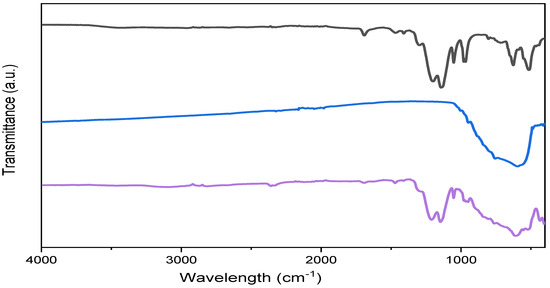 FTIR spectra of recast Nafion (black), tungsten oxide nanofiller calcinated at 700 °C (blue), and 15 wt% WO3–Nafion hybrid membrane (purple).