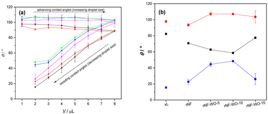 (a) Mean advancing and receding CAs with standard errors of three parallel measurements as a function of droplet volume, Nafion XL commercial membrane (black), recast Nafion membrane (red), Nafion membrane with 5, 10, and 15 wt% tungsten oxide (blue, green, and purple, respectively); (b) Maximum mean advancing (θmax—red) and minimum mean receding (θmin—blue) CAs with standard errors of three parallel measurements, and the CA hysteresis (Δθ = θmax − θmin—black).