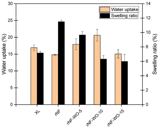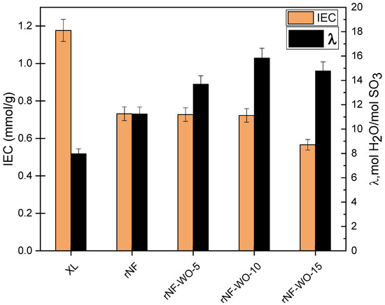Water uptake and swelling ratio are usually used to describe the hydration behaviour of membranes. From an application point of view, both good water uptake and a low swelling ratio are desirable. The influence of different tungsten oxide nanofiller contents on the water uptake and swelling ratios of the membranes in DI water at room temperature is presented in Figure 9. The recast membrane exhibited good water uptake; however, it also showed a high swelling ratio, which may lead to a higher hydrogen crossover rate. The water uptake increased with the increasing the WO3 nanofiller content up to 10 wt. %, then it slightly decreased. Contrarily to the increase of water uptake, the swelling ratio decreased with the increasing WO3 content, and dropped significantly below the level of XL already at 10% nanofiller content, while the water uptake was still high. As compared to the unfilled Nafion membranes, the hybrid membrane with 10 wt% tungsten oxide is a more ideal material in terms of both water uptake and swelling ratio. Nevertheless, at too high a WO3 content (15 wt%), the water uptake drops as well. This phenomenon can be attributed to a masking effect of the SO3H groups upon the addition of a higher nanofiller amount, inhibiting the water uptake of the polymer chains. In addition, there is also a possibility for the aggregation and formation of a thick nanofiller layer on the outer surface of the membrane [3,41]. Such an explanation is consistent with the fact that rNF–WO-15 showed slightly lower advancing and receding contact angles than both rNF–WO-5 and rNF–WO-10. Nevertheless, it has to be emphasised again that, compared to the commercial Nafion XL membrane, rNF–WO-10 shows better performance, as it presents a higher water uptake while controlling the swelling ratio of the membranes, which restricts the hydrogen crossover of the membrane as well [55].