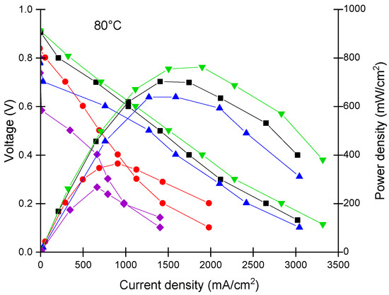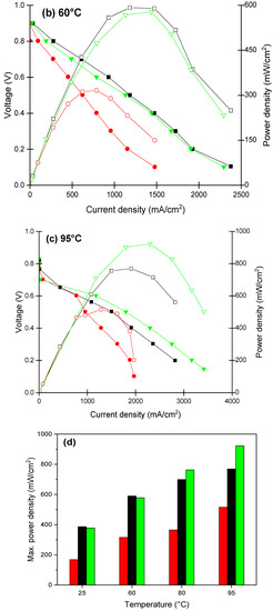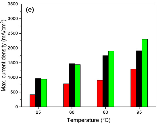 Figure 12d,e show the maximum power densities and maximum current densities obtained at 0.4 V based on the New European Driving Cycle protocol [71]. All three membranes showed improving performance with increasing temperature. At lower temperatures, the Nafion XL membrane showed slightly higher performance than the rNF–WO-10. However, at the higher temperatures, the rNF–WO-10 showed the highest maximum power density, reaching 0.76 and 0.922 W/cm2 at 80 and 95 °C, respectively. The maximum current of rNF–WO-10 is the highest among the three membranes when operating at 80 °C and 95 °C, with values of 1.89 and 2.29 A/cm2, respectively.