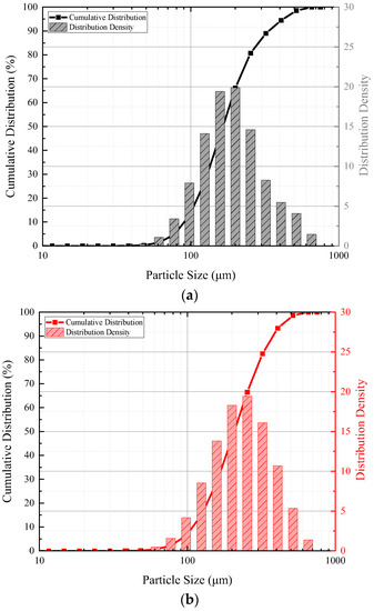 To evaluate the particle size, the size distribution and cumulative curve of three microcapsules were determined via particle size analysis (S3500 Microtrac Inc.) with ethanol as the eluent. The results are presented in Figure 1a–c and details are summarised in Table 2. Moreover, the morphology of the microcapsule was determined by PIP 9.1 Particle Image Processor using an OMEG instrument, which is shown in Figure 1d–e, and the roundness of the microcapsule is presented in Table 2, which suggests that the average sizes of small, medium and large microcapsules were 164.98 µm, 202.38 µm, and 241.16 µm, respectively, and the roundness of three microcapsules were almost the same.