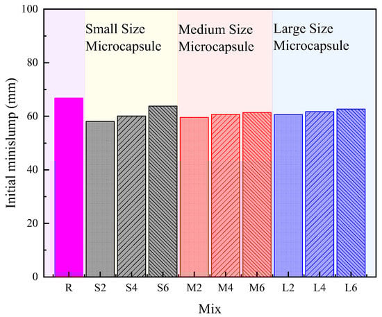 The effect of microcapsule size and content on the workability of cement pastes are presented in Figure 2. It can be clearly seen that the addition of microcapsules slightly decreased the minislump of cement pastes, which was similar to the previous report that the addition of microcapsules with solid MgO core decreased the minislump of cement pastes [27]. This reduction in the initial minislump might be due to the addition of microcapsules that modified the viscosity of the cement pastes by introducing the crowding effect [48,49]. However, compared to the reference [27], the difference between the cement pastes without microcapsules and with microcapsules was not significant. The result could be due to the fact that, in this study, the cement paste under standard consistency was prepared, which provided a limited range for measuring the change in workability. Moreover, although the difference was confined, it was generally shown that the increased microcapsule content increased the workability, in which the microcapsules with small particle sizes were more pronounced. Again, the results for those phenomena could be attributed to the crowding effect of introducing microcapsules into cement pastes.