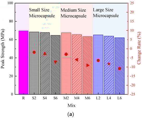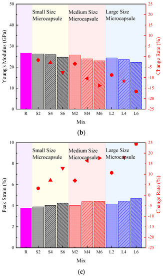 Effect of microcapsule size and content on the mechanical properties and change rate of cementitious materials. (a) peak strength; (b) Young’s modulus; (c) peak strain.