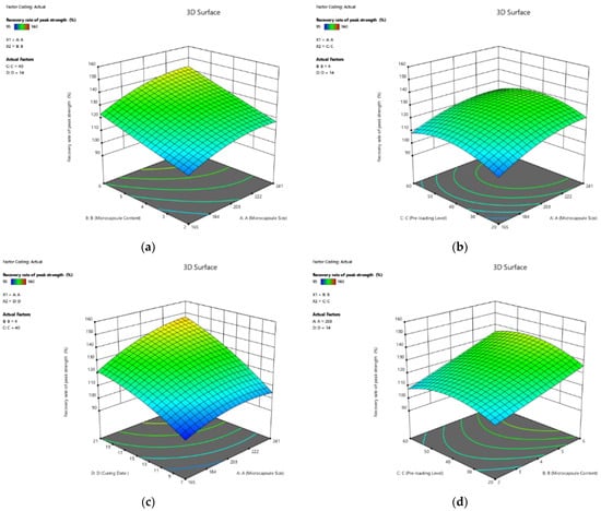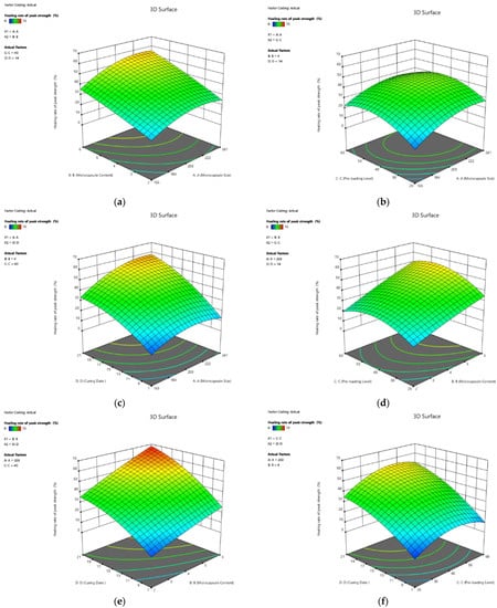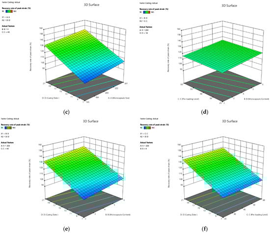 The 3D response surface plots of the healing rate of the peak strength with the interactive relationship among the four factors are shown in Figure 4a–f. Based on Equation (10), the healing rate of the peak strength response increased with the increase in all four factors, namely, microcapsule size, microcapsule content, pre-loading level, and curing age. Moreover, the higher coefficient of curing age, which was approximately 3.3 times larger than those of pre-loading level, indicates that the curing age significantly affected the peak strength of the pastes. Moreover, the interaction between every two factors showed its influence on the healing rate of peak strength. However, since the value of coefficients was less than that of a single factor, the contribution from those interactions was less.