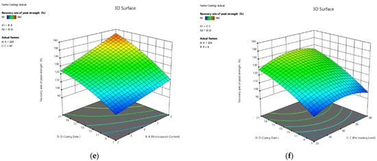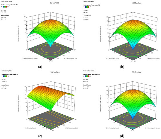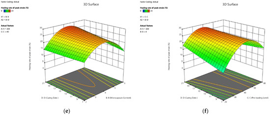 The 3D response surface plots based on Equation (12) are shown in Figure 8. It is shown that the four factors positively contributed to the healing rate of peak strain. For example, the coefficients of all the four single factors were positive. Moreover, the value of coefficients revealed that curing age contributes to the healing rate of peak strain more significantly than other factors. It should be noted that the interactions between the factors showed almost equal contributions to the healing of peak strain. For example, the coeffect of X3X4 was −0.34, which was higher than that of X4 (1.38), indicating that the effect of the combined factors could not be ignored.