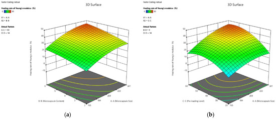 The 3D response surface plots, visualizing the effect of the four factors on the healing rate of Young’s modulus of cement pastes, are plotted as the response surfaces in Figure 6. As shown in Equation (12), the healing rate of Young’s modulus increased with the increase in the four factors. Moreover, the influences in the order of decreasing magnitude are curing age, microcapsule size, pre-loading level, and microcapsule. However, the difference in contribution to the healing rate was not obvious. Similar to its influence on peak strength, the interaction between the two factors was similar to that of a single factor.
