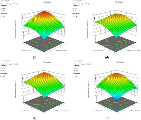 The 3D response surface plots based on Equation (11) are shown in Figure 7a–f. Similar to the effect on the healing rate (Figure 6), the recovery rate of Young’s modulus response increased with the increase in the four factors. Moreover, it is obvious that the coefficient of the curing age (10.70) was approximately 3.47 times higher than that of the pre-loading level, indicating that the curing age can significantly affect the recovery rate of the self-healing cement paste. Moreover, the interactions between the two factors provided a limited contribution to the recovery rate, excepting the terms with X4 (curing age), which again, confirmed the most significant influence of curing age.