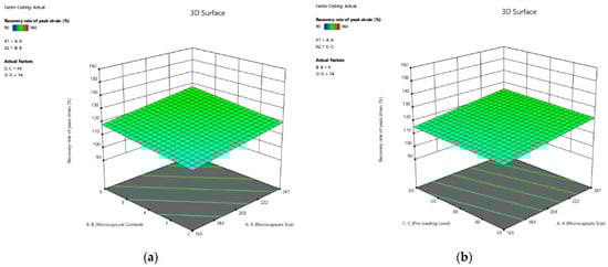 The 3D response surface plots, visualising the effect of the four factors on the recovery rate of peak strength of self-healing cement pastes, are plotted in Figure 5. Similar to the influence on the healing rate, the recovery rate of peak strength increased with the increase in all four factors. Moreover, the influences in the order of decreasing magnitude are curing age, microcapsule content, microcapsule size, and pre-loading level. For example, the coefficient of curing age showed an approximately 7.45 times greater effect on increasing the recovery rate than the pre-loading level (16.99 vs. 2.28 in Equation (11)).