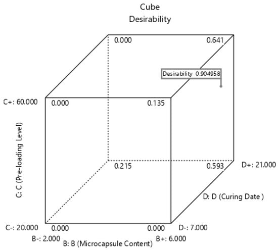 The desirability function (DF) is normally applied to establish the optimum criteria based on multi-variables (factors). The general procedure is to convert the desirability function for each response into the unique desirability function as , in which the better optimisation could be achieved when is close to 1. The numerical optimisation process was conducted, the parameters and predicted target values are listed in Table 8 and cubic graphs of the desirability functions are plotted in Figure 10. It should be noted that since it is very difficult to precisely control the microcapsule size, considering the general trend from results, the microcapsule size was set as 203 nm during the optimisation process. As shown in the table and figure, the predicted values for the six responses generated from the optimisation are 66.62% of the healing rate of peak strength, 152.20% of the recovery rate of peak strength, 44.71% of the healing rate of Young’s modulus, 131.16% of the recovery rate of Young’s modulus, 22.56% of healing rate of peak strain, and 141.50% of the recovery rate of peak strain with the highest desirability of 0.9060. Accordingly, the optimum conditions of the four variables (factors) are 203 nm, 5.59%, 43.56%, and 21 days for the microcapsule size, microcapsule content, pre-loading level, and curing age, respectively. Thus, it can be conducted that by following the optimum recipe computed for the four factors, a PMMA/epoxy microcapsule-based self-healing cementitious material with desirable mechanical properties can be obtained.