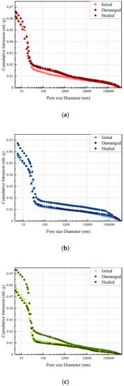 The pore structures of three typical mixes, in terms of Run 1, Run 15, and Verification Run 1, in different states (initial, damaged, and healed) were investigated by using MIP, and the details of the results are presented in Figure 11 and Figure 12. In addition, the generated parameters of the pore structure, including in terms of porosity, average pore diameter, pore volume and fractions of gel pore capillary pore, and macropores defined as diameters less than 10 nm, ranging from 10 to 100 nm, and more than 100 nm, respectively [55], are summarised in Table 10. As shown in the figure, for all three samples, compared to the initial state, the porosity, the average pore diameter, and the pore volume were significantly increased when the specimen was in a damaged state, which might be due to the introduced cracks from the pre-loading process. However, after the self-healing process occurred, the porosity average pore diameter and pore volume were further reduced, indicating that the pore structure of the specimens was refined, which further confirmed the improved mechanical property of the specimens as demonstrated in Section 3.3. Moreover, it should be noted that the proportion of the micropores, which is related to the compressive strength (peak strength) of the specimen, was significantly increased when the pre-loading was applied, while it further decreased after the healing process occurred, which further confirmed the results presented in Table 6 and Table 9. This can be attributed to the repairing work of epoxy inside the microcapsule, which can fill macropores, resulting in less porosity and a reduced proportion of microcapsules.